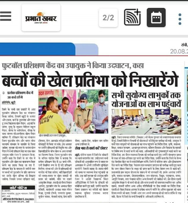 इसी कड़ी में आज 8 फुटबाल प्रशिक्षण केंद्र पहला केंद्र कमंता खेल मैदान खूंटी , प्रशिक्षक मनोहर नाग, टकरा खेल मैदान खूंटी, प्रशिक्षक प्रकाश कच्छप, बालिका फुटबॉल प्रशिक्षण केंद्र राजकीय प्राथमिक उच्च विद्यालय डूमरदगा खेल मैदान, खूंटी प्रशिक्षक अनमोल टूटी,